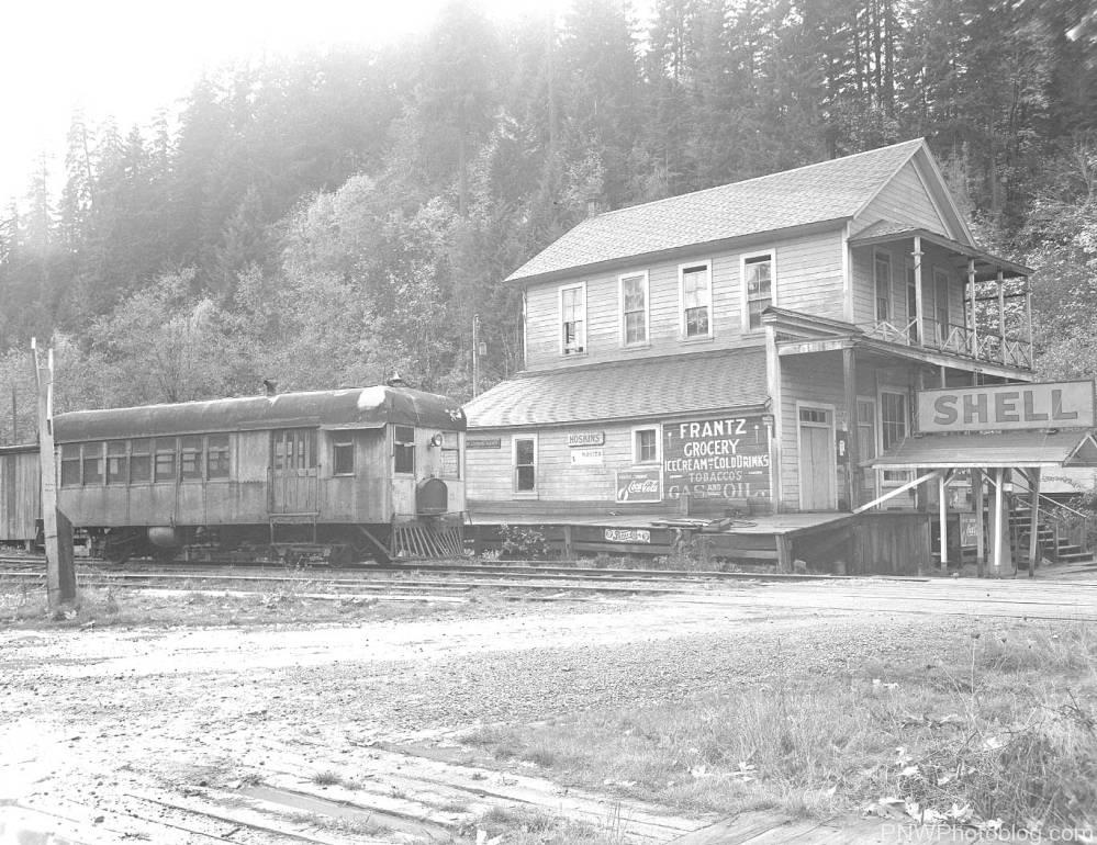 Frantz Grocery Story at the railroad station of Hoskins, Oregon, 1942. From the Ben Maxwell Collection