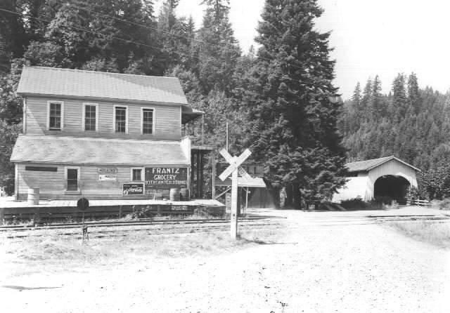 Frantz Grocery and Hoskins Covered Bridge. From what I can tell, the location of the grocery store is now just a dirt field. From the Ben Maxwell Collection