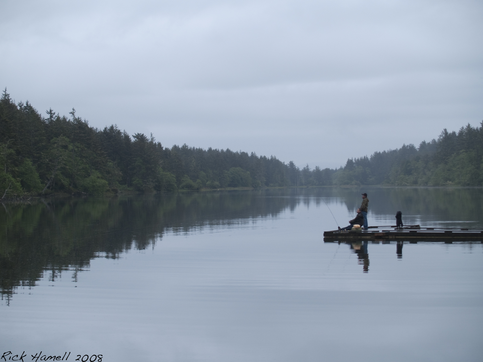 Early morning fishing on Coffenbury Lake in Fort Stevens Park near Astoria, Oregon.